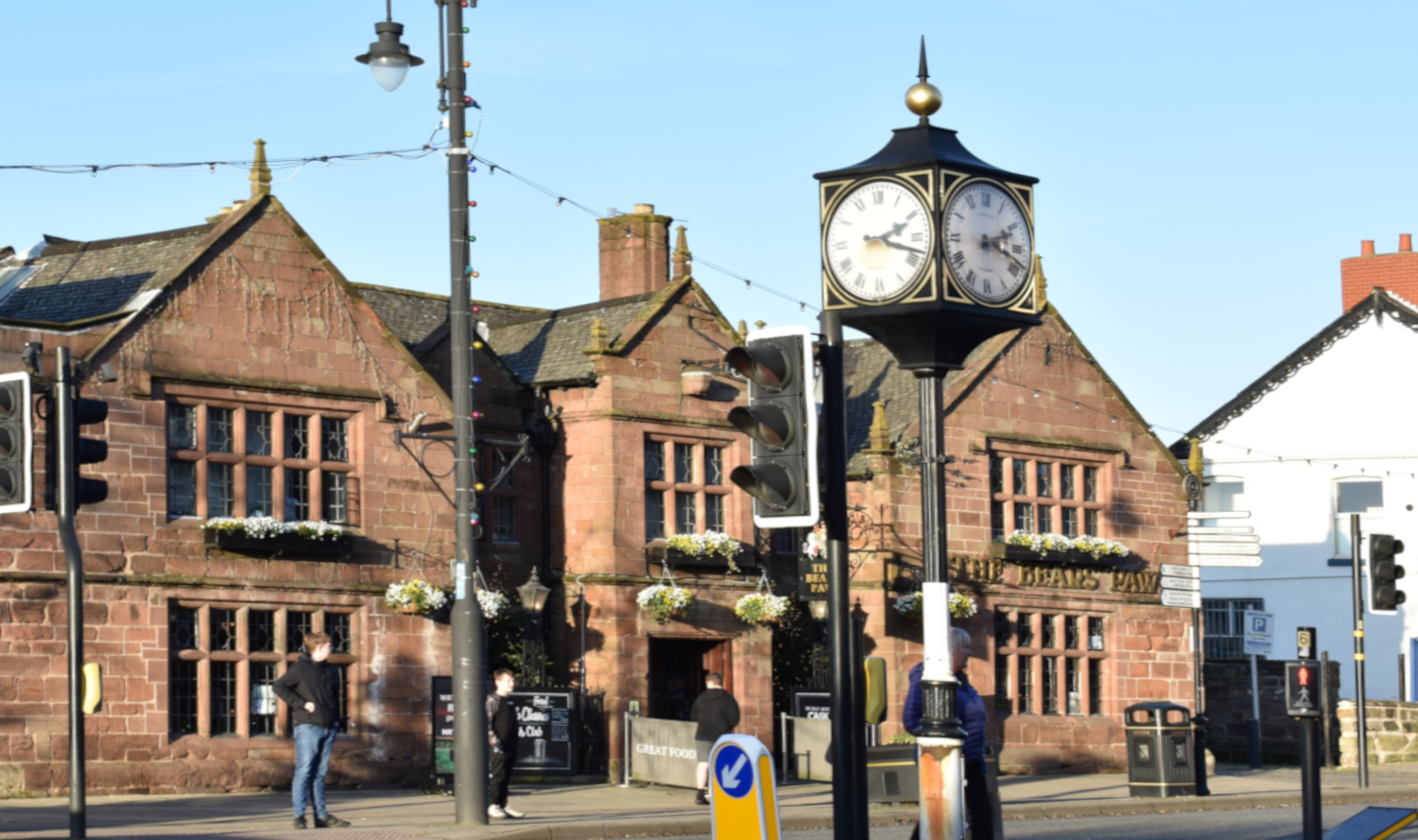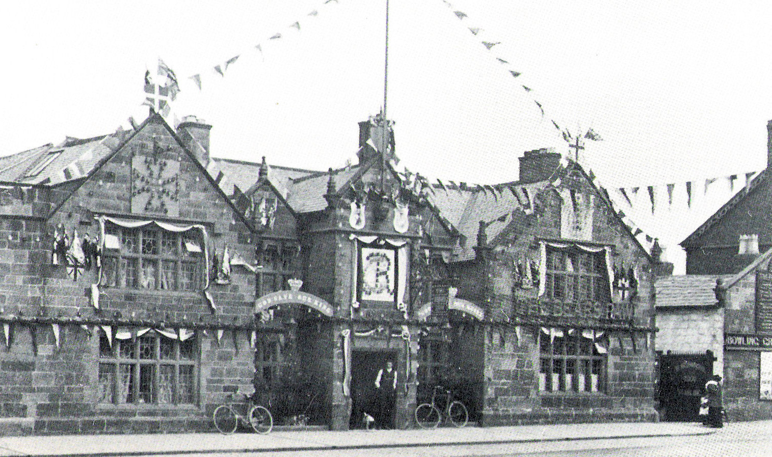 Bears Paw Hotel, Coronation Day, 1911. This old coaching inn built in 1612, was where mail was collected and despatched before the Post Office came into being. Its name derived from the bear's paw in the coat of arms of the Savage family, Lords of the Manor of Frodsham from the early seventeenth century. Although it's a lion, not a bear!