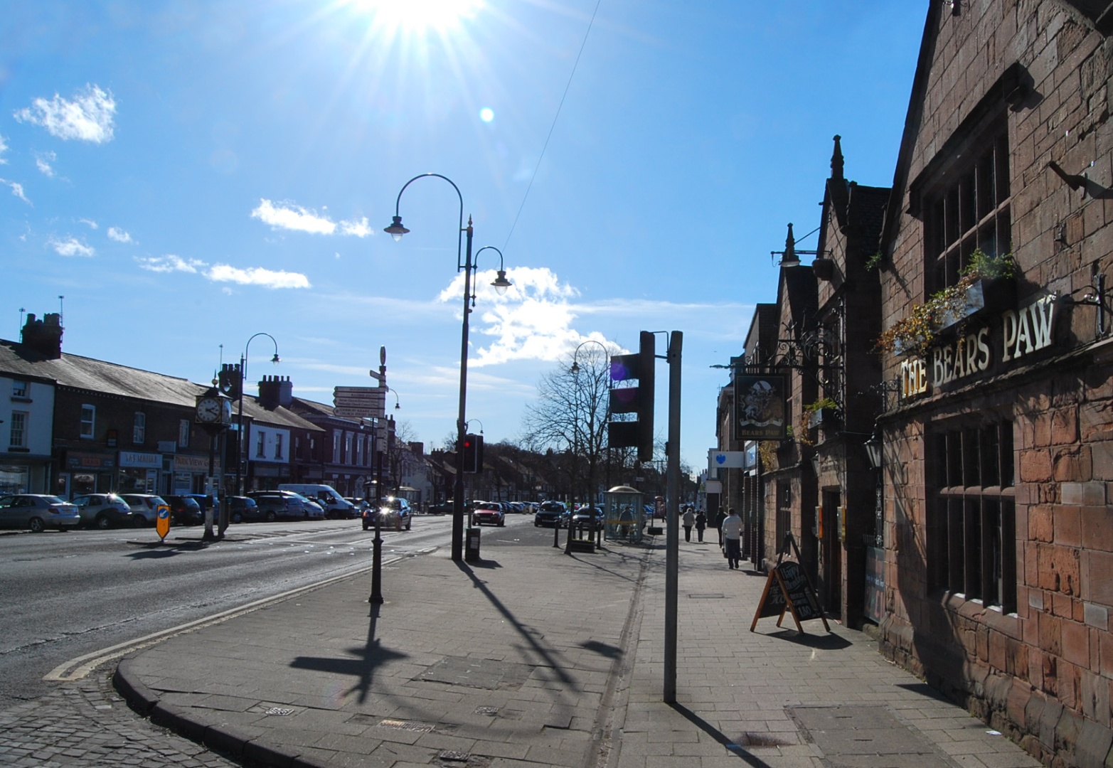 Bears Paw Hotel, Coronation Day, 1911. This old coaching inn built in 1612, was where mail was collected and despatched before the Post Office came into being. Its name derived from the bear's paw in the coat of arms of the Savage family, Lords of the Manor of Frodsham from the early seventeenth century. Although it's a lion, not a bear!